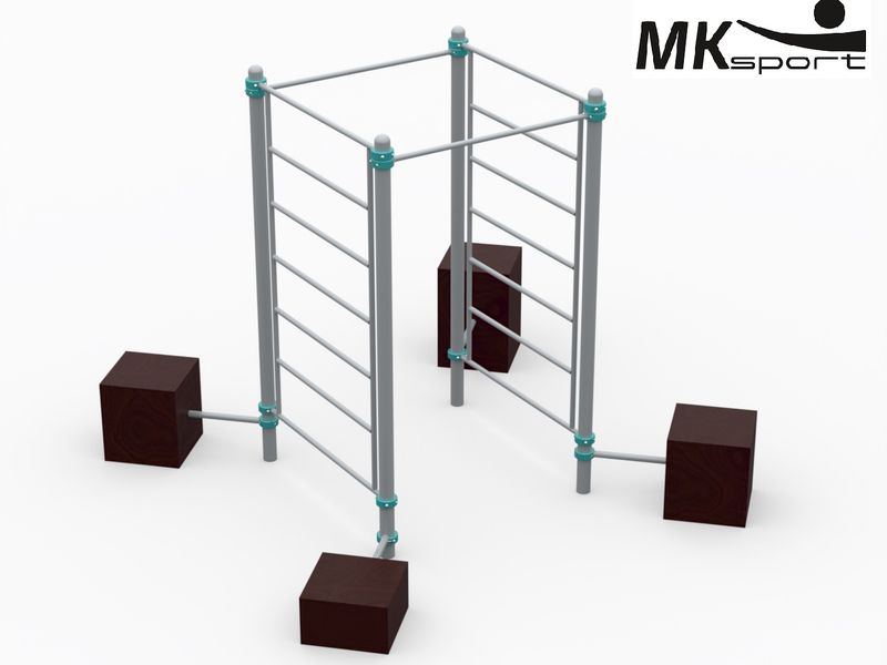 Воркаут-площадка состоит из двух турников, двух шведских стенок и комплекта плиобоксов разной высоты для запрыгиваний. Турник и шведская стенка предназначены для тренировки мышц рук, спины, плечевого пояса и пресса. Тумбы для запрыгиваний помогут укрепить мышцы ног, развить выносливость и чувство баланса. Основа каркаса комплекса – стальные трубы 89*3 мм, перекладины турников и шведских стенок изготовлены из труб 32*3 мм. Плиобоксы выполнены из влагостойкой ламинированной фанеры на металлокаркасе. Основной цвет оборудования серый, хомуты бирюзовые.